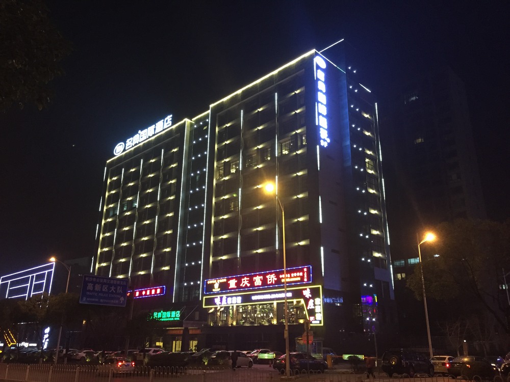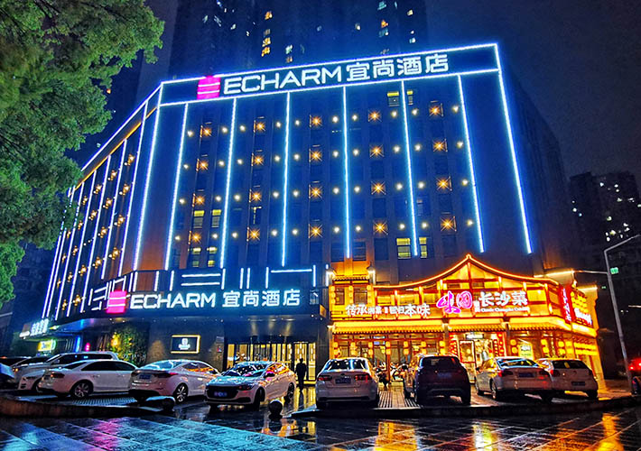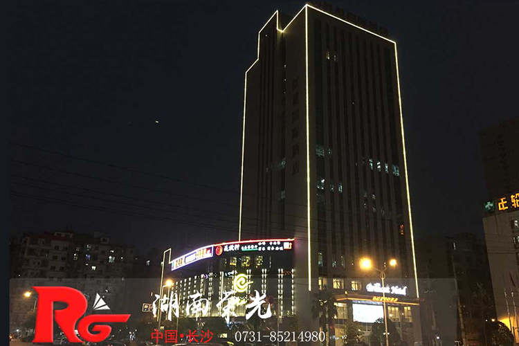 長沙酒店亮化 戶外亮化設(shè)計(jì) LED夜景亮化安裝及施工工程采用IP 65防護(hù)等級的LED線條燈,十字星光燈搭配設(shè)計(jì)。燈具色溫采用冷、暖色搭配設(shè)計(jì),主線條燈勾勒出建筑亮化的輪廓,采用暖色星光燈營造長沙酒店亮化的溫馨氛圍。